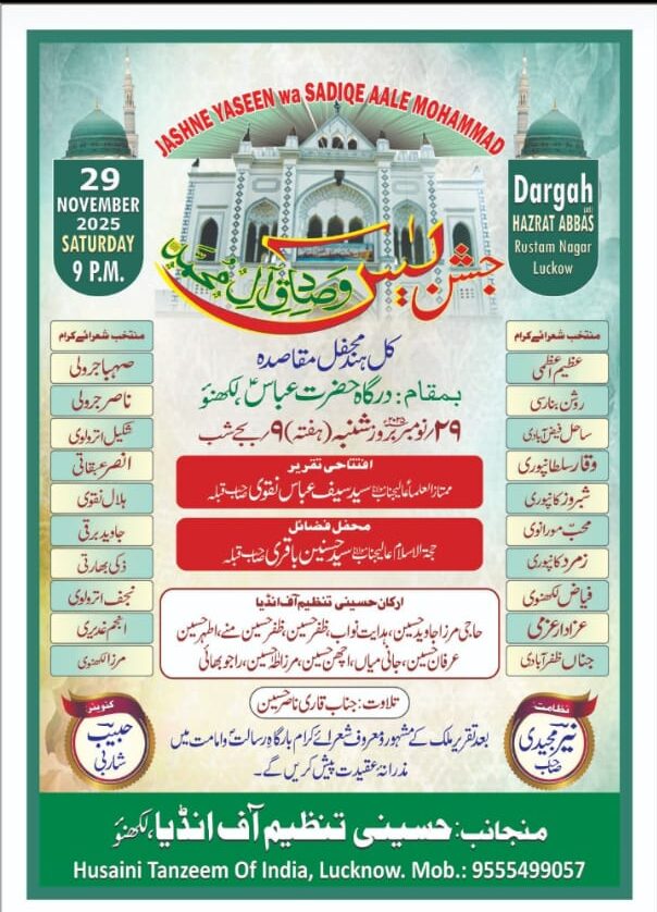 लखनऊ, 26 नवंबर। हुसैनी तंजीम ऑफ़ इंडिया ने आज दरगाह हज़रत अब्बास अस रोड पर स्थित एन के पैलेस में शाम को 7:30 बजे ऑल इंडिया जश्ने यासीन की तैयारियों के सिलसिले में एक और महत्वपूर्ण बैठक का आयोजन किया। बैठक में बताया गया,हर साल की तरह इस साल भी होने वाली इस अज़ीमऊशान महफिल को पूरी शान ओ शौकत के साथ संपन्न कराया जा रहा है। आज की दूसरी मीटिंग में महफिल के कन्वीनर हबीब शारबी ने बताया कि 29 नवंबर, बरोज़ हफ्ता को होने वाली आल इंडिया महफिल ए मकासदे के लिए सभी बेरुनी वा मकामी शायरों से मंजूरी मिल गई है।
