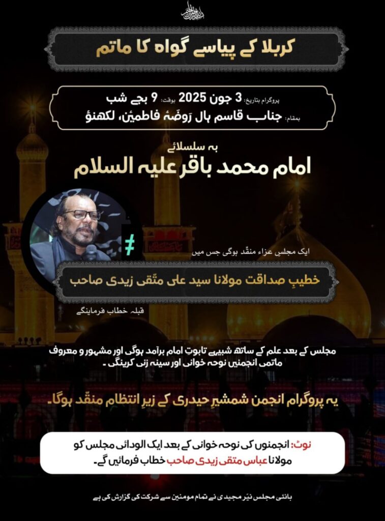 लखनऊ 2 जून। कर्बला के प्यासे गवाह का मातम के उनवान से क़दीम मजलिस ए अज़ा वा ताबूत ताबूत कल 3 जून 2025 को शब में 9:00 बजे पुराने लखनऊ में स्थित हजरत कासिम हाल रौज़ा ए फातमैन में शहादत ए इमामे मोहम्मद बाकिर अस एक मजलिस को मौलाना सैयद अली मुतक्की ज़ैदी साहब खिताब फरमाएंगे । बनिए मजलिस नय्यर मजीदी की इत्तिला के मुताबिक मजलिस के बाद शबीह ए ताबूत व अलम ए मुबारक के साथ-साथ नौहा ख्वानी करते हुए तमाम मोमिनीन रौज़ा ए फातमैन जाएंगे।