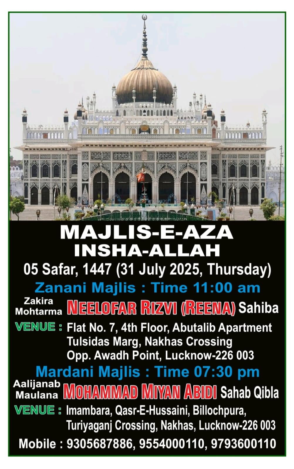 तमाम मोमिनीन वा मोमेंनात से कसीर तादात में मजलिस में शिरकत किए जाने की गुजारिश की गई है।
