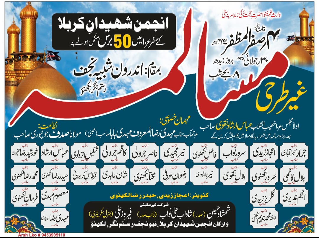 इसी सिलसिले में आज अंजुमन के सेक्रेटरी फिरोज अली के घर पर एक अहम बैठक में अंजुमन के पदाधिकारियों ने हिस्सा लिया और अपने विचार रखे। मजलिस की शुरुआत तिलावत-ए-कलाम-ए-पाक से होगी, जिसके बाद जनाब अब्बास इरशाद नकवी मजलिस को संबोधित करेंगे। यह मजलिस रात 8 बजे रुस्तम नगर, कश्मीरी मोहल्ला, लखनऊ में शबीह-ए-नजफ के अंदर होगी। इस खास मौके पर मेहमान-ए-खुसूसी मेहंदी रजा (मेहंदी बाबा) होंगे। मजलिस की निजामत मौलाना सदफ जौनपुरी करेंगे। इस मजलिस में शामिल होने वाले शायरों में जर्रार अकबराबादी, एजाज ज़ैदी, सरवर नवाब, फाजिल लखनवी, नय्यर मजीदी, नासिर जरवली, काजिम जरवली, शकील अतरौलवी, मौलाना अब्बास इरशाद, खुर्शीद रजा फतेहपुरी, बिलाल काजमी, सुरूर लखनवी, हिलाल नकवी, नय्यर जलालपुरी, रिजवान उर्फी, मुख्तार लखनवी, शान आबदी, क़िरतास करबलाई, हैदर रजा लखनवी, मोहम्मद रजा लखनवी, अंजुम गदीरी, गुलरेज जैदी, मासूम मेहंदी, फरमान लखनवी, कारी मोहम्मद नदीम नजफी और मेहंदी रजा शामिल हैं। इस मसालमें के संयोजक जनाब एजाज जैदी और हैदर रजा लखनवी हैं। अंजुमन के अध्यक्ष शमशाद हुसैन, उपाध्यक्ष शादाब अली नवाब, जनरल सेक्रेटरी फिरोज अली और अंजुमन के अन्य सदस्यों ने सभी मोमिनीन से इस प्रोग्राम में शामिल होने की अपील की है।