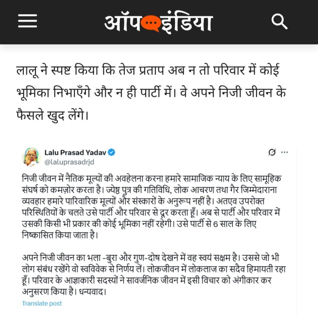 25 मई 2025 को X पर कई पोस्ट्स में दावा किया गया कि लालू प्रसाद यादव ने अपने बड़े बेटे तेज प्रताप यादव को 6 साल के लिए RJD से निष्कासित कर दिया है, साथ ही उन्हें परिवार से भी बाहर का रास्ता दिखा दिया। वजह बताई जा रही है तेज प्रताप का “गैर-जिम्मेदाराना व्यवहार” और “लोक आचरण के खिलाफ गतिविधियां”, जो लालू परिवार के मूल्यों और RJD की विचारधारा से मेल नहीं खातीं। खास तौर पर, एक X पोस्ट में दावा किया गया कि तेज प्रताप ने सोशल मीडिया पर अपनी कथित प्रेमिका अनुष्का यादव के साथ एक तस्वीर शेयर की थी, जिसके बाद यह विवाद खड़ा हुआ।